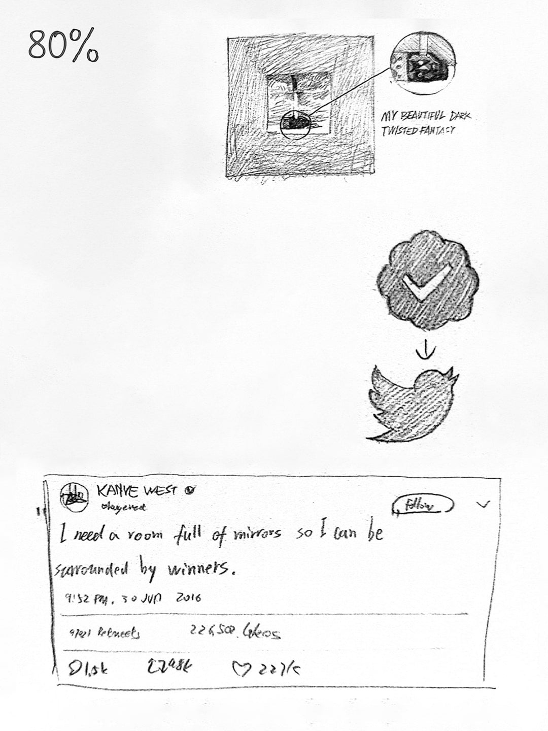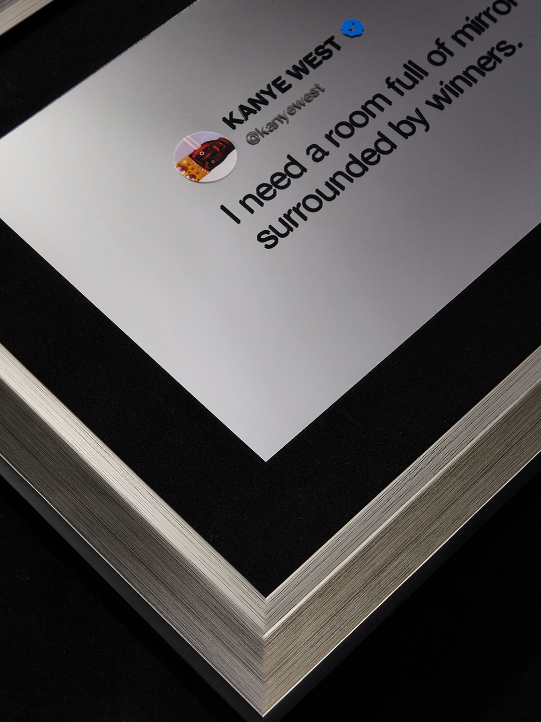 sample origins - This piece traces back to one of the most memorable moments in internet history - Kanye West once tweeted: “I need a room full of mirrors so I can be surrounded by winners.”